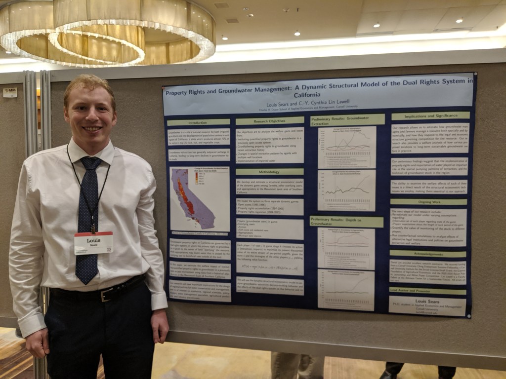 “Property rights and groundwater management: A dynamic structural model of the dual rights system in California.” Poster presentation. Agricultural and Applied Economics Association (AAEA) Annual Meeting. Atlanta, GA. July 2019.
